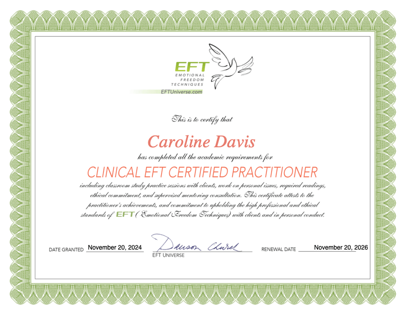Inspired by my positive experience, I embarked on a year-long Clinical EFT Certification program with EFT Universe. This comprehensive evidence-based training equipped me with the skills to guide you on your own transformative journey, helping you reduce anxiety, heal trauma, and reprogram limiting beliefs.